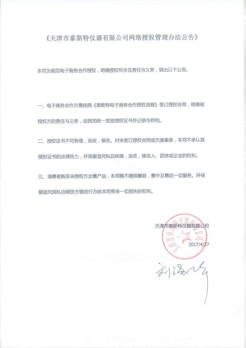 《天津市泰斯特儀器有限公司網(wǎng)絡授權管理辦法公告》